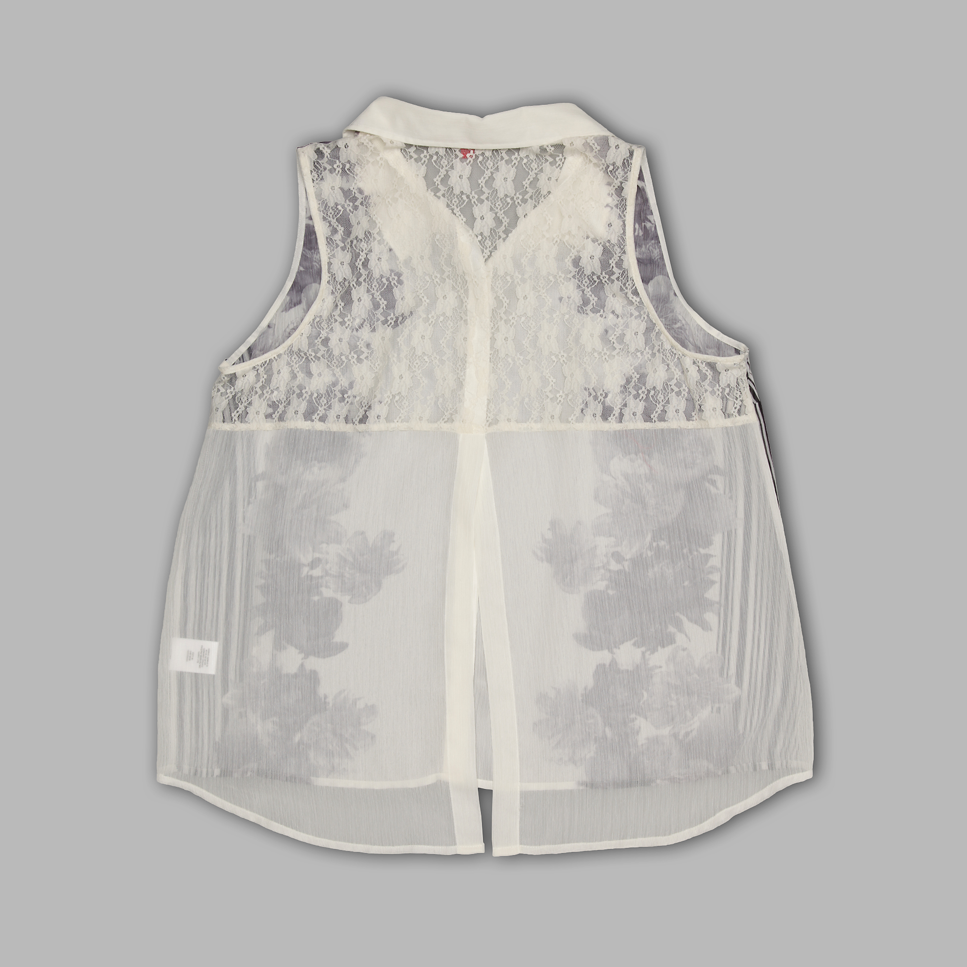 You'll love your leggings and skinny jeans even more when paired with this sheer chiffon junior's shirt from Bongo. The sleeveless top features pretty peony print on the front and a lace inset back yoke. Best of all, this top has a drop-tail hem that's spliced all the way to the yoke for a fluttery effect when you step out on the town.