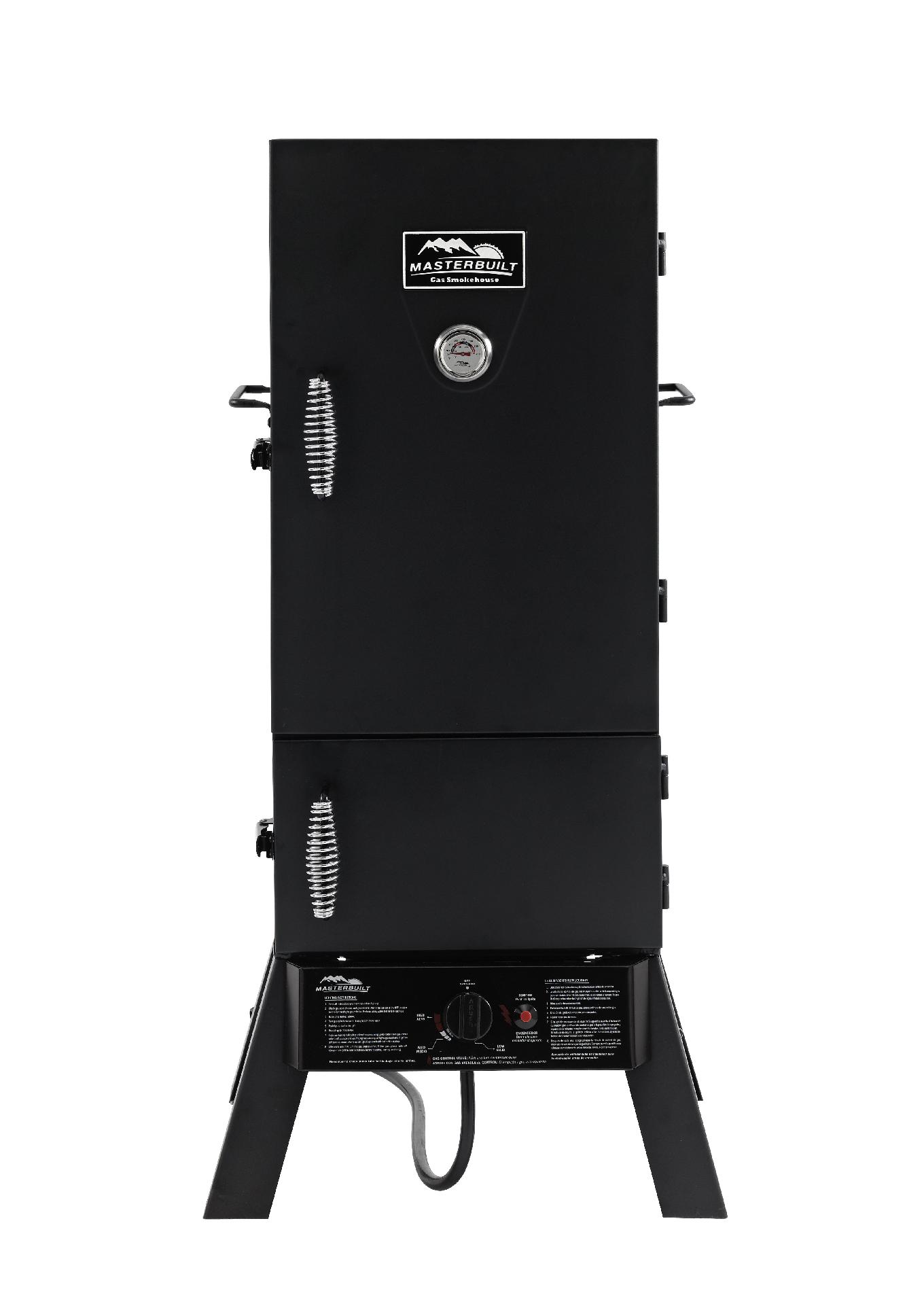 The Masterbuilt Dual Door Vertical Gas Smoker will have you enjoying juicy and flavorful slow-smoked foods without ever having to leave home. With 717 square inches of cooking space and an output of over 15,000 BTUs, this Masterbuilt Smoker provides plenty of room and power to smoke-up a small feast. The push-button ignition makes starting it is a cinch, and the built-in temperature gauge allows you to easily monitor the temperature to ensure even cooking. Thanks to the dual door design, you can add wood and water with minimal heat loss, and a lock on the door helps to further trap heat.